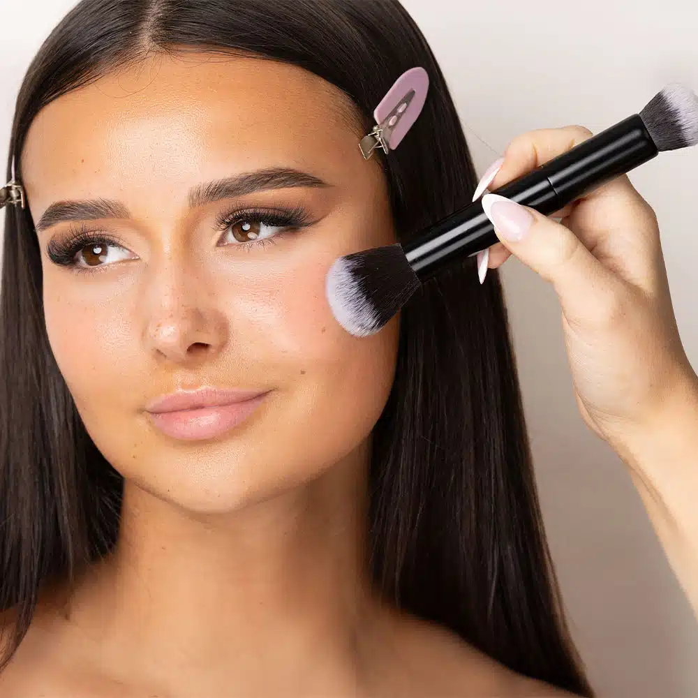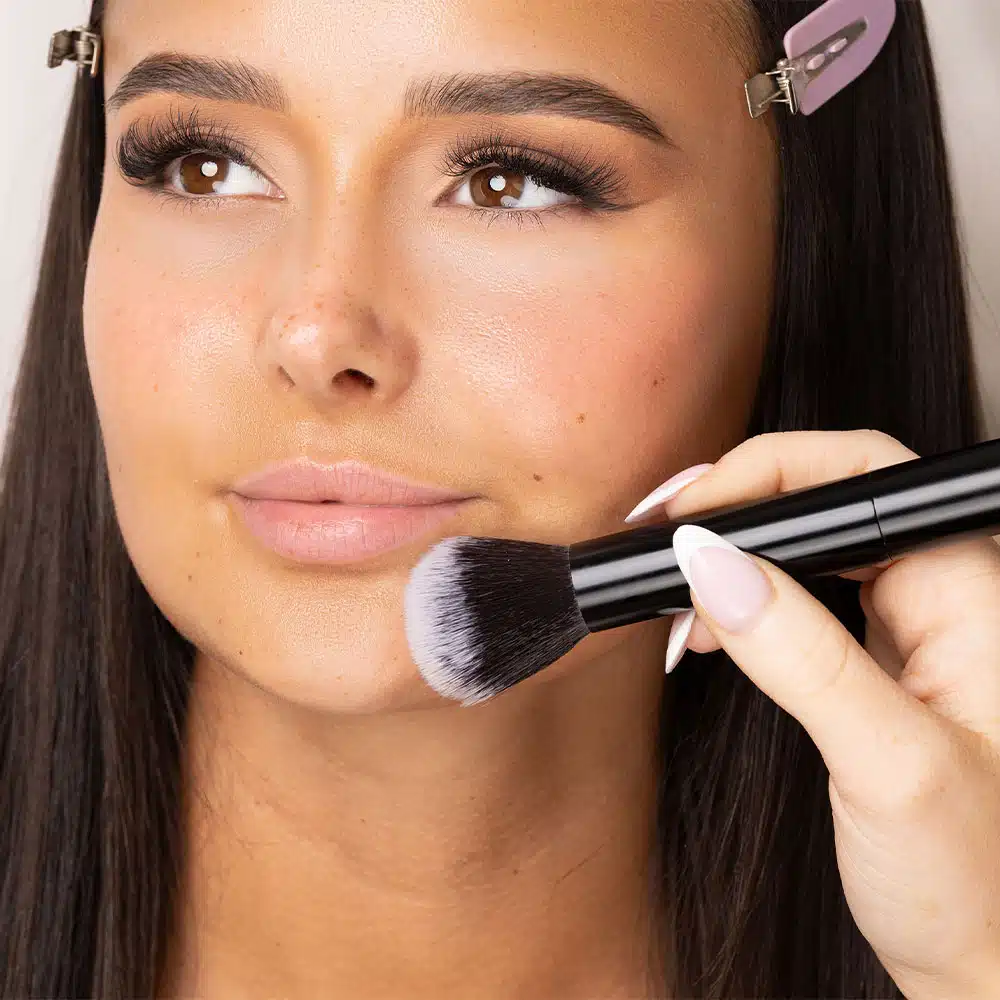 • Estompez et fixez votre maquillage avec le pinceau poudre, en effectuant de légers mouvements de balayage pour contrôler la brillance et obtenir un fini lisse.